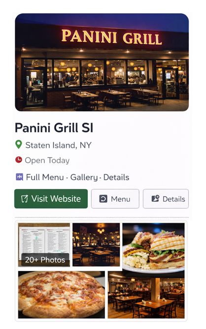 Each restaurant listing includes • Menus • Photos • Full Details